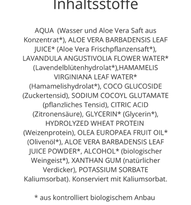 Pflanzliche Tenside reinigen sanft, aber gründlich, Aloe Vera verhindert das Austrocknen der Haut. Hammamelis- und Lavendelhydrolat wirken entzündungshemmend