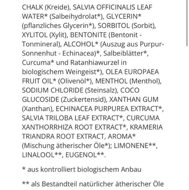 Unsere Zahncreme wurde in Zusammenarbeit mit Zahnärzten entwickelt. Sie reinigt die Zähne sanft mit natürlichen Putzkörpern aus Kreide und Tonmineralien, die den Zahnschmelz schonen und biologische abbaubar sind, und pflegt und kräftigt das Zahnfleisch mit Kräuterauszügen von Echinacea, Salbei, Rhataniawurzel und Kurkuma. Ohne Zucker, ohne Fluorid. Für die ganze Familie geeignet.