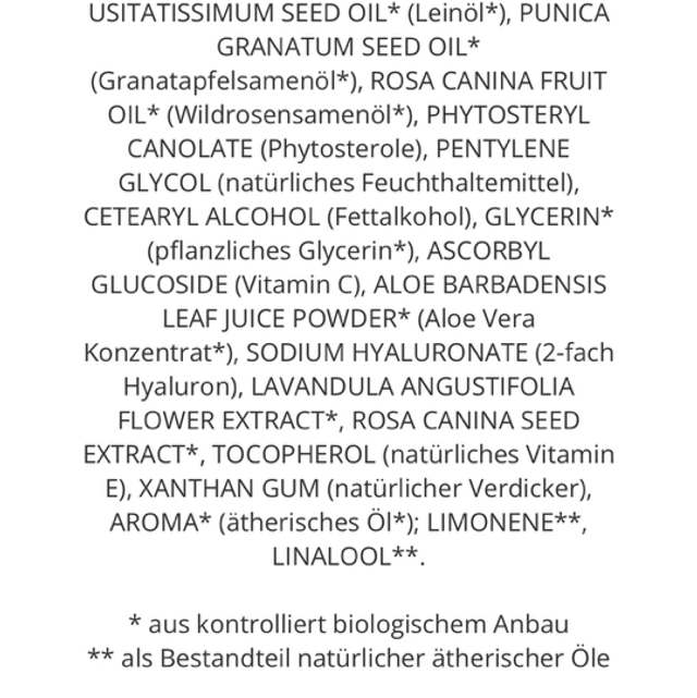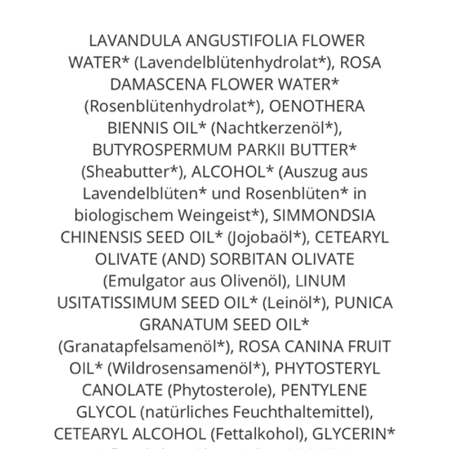 LAVANDULA ANGUSTIFOLIA FLOWER WATER* (Lavendelblütenhydrolat*), ROSA DAMASCENA FLOWER WATER* (Rosenblütenhydrolat*), OENOTHERA BIENNIS OIL* (Nachtkerzenöl*), BUTYROSPERMUM PARKII BUTTER* (Sheabutter*), ALCOHOL* (Auszug aus Lavendelblüten* und Rosenblüten* in biologischem Weingeist*), SIMMONDSIA CHINENSIS SEED OIL* (Jojobaöl*), CETEARYL OLIVATE (AND) SORBITAN OLIVATE (Emulgator aus Olivenöl), LINUM USITATISSIMUM SEED ….