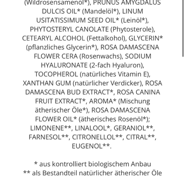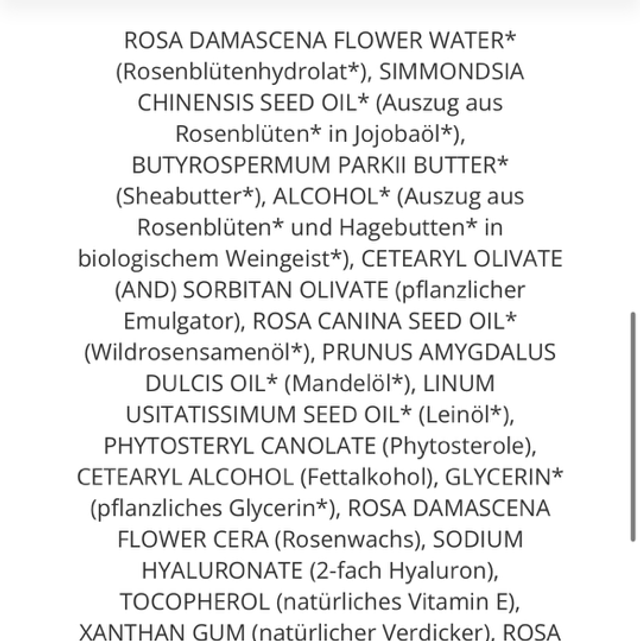 ROSA DAMASCENA FLOWER WATER* (Rosenblütenhydrolat*), SIMMONDSIA CHINENSIS SEED OIL* (Auszug aus Rosenblüten* in Jojobaöl*), BUTYROSPERMUM PARKII BUTTER* (Sheabutter*), ALCOHOL* (Auszug aus Rosenblüten* und Hagebutten* in biologischem Weingeist*), CETEARYL OLIVATE (AND) SORBITAN OLIVATE (pflanzlicher Emulgator), ROSA CANINA SEED OIL* (Wildrosensamenöl*), PRUNUS AMYGDALUS DULCIS OIL* (Mandelöl*), LINUM USITATISSIMUM SEED OIL* (Leinöl*), PHYTOSTERYL CANOLATE (Phytosterole), CETEARYL ALCOHOL (Fettalkohol), GLYCERIN* (pflanzliches Glycerin*), ROSA DAMASCENA FLOWER CERA (Rosenwachs), SODIUM HYALURONATE (2-fach Hyaluron), TOCOPHEROL (natürliches Vitamin E), ..